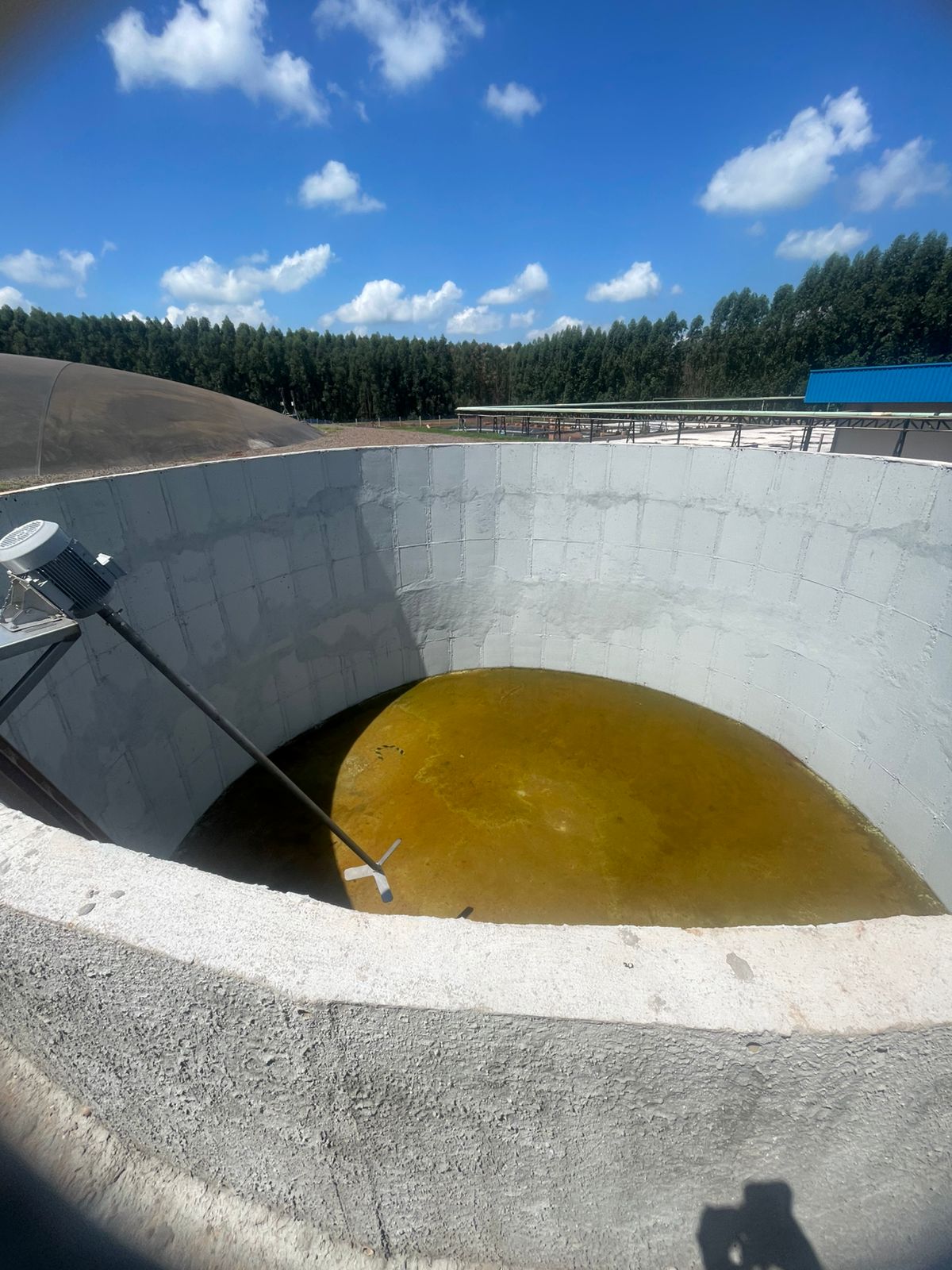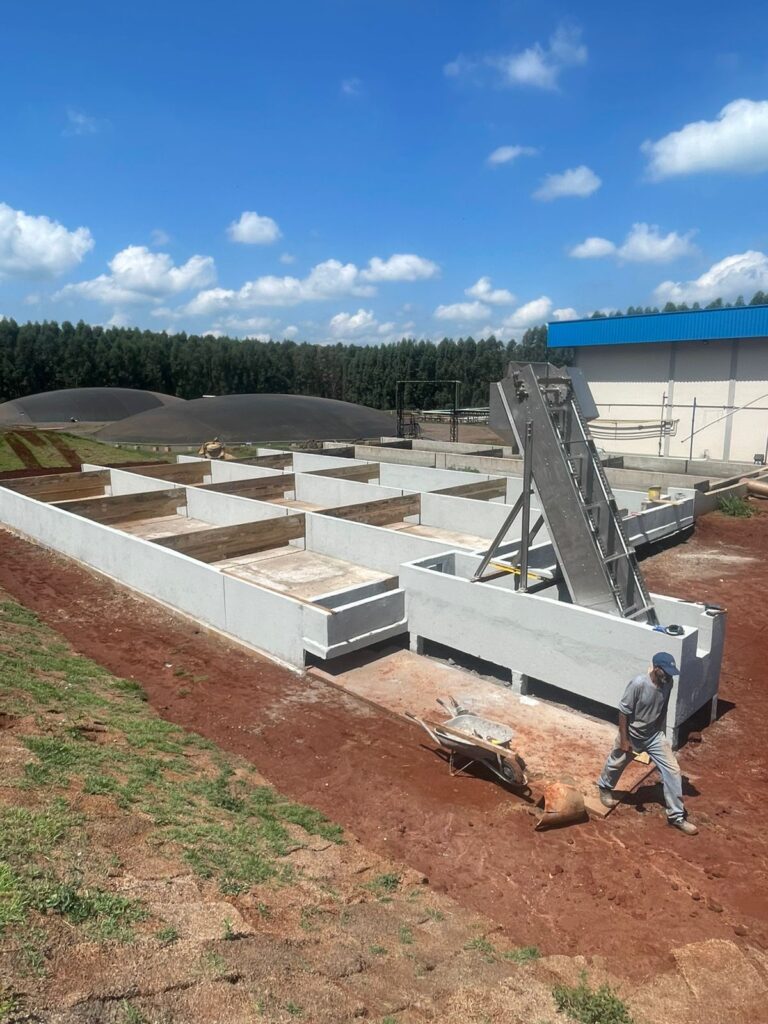 Ampliação de sistema de tratamento de esgotos para dejetos suínos, composto por Caixa de Gradeamento em concreto armado, Caixa de Sedimentação com três células, Tanque de Equalização em concreto armado com diâmetro 9,95m e profundidade 4,80m.